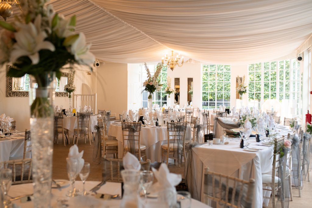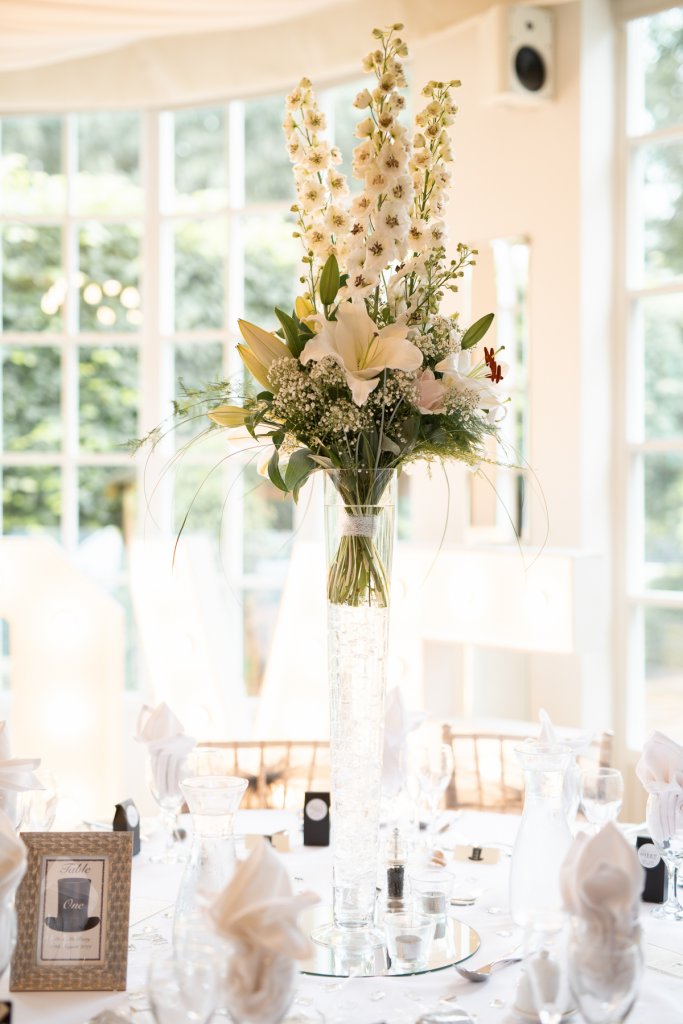 Dan Knight entertained guests before the wedding breakfast began, the banqueting hall looked great with centrepieces by Jacqueline the florist and a top hat cake by All Things Cakey in Daventry. Later the cake was cut and the first dance began!