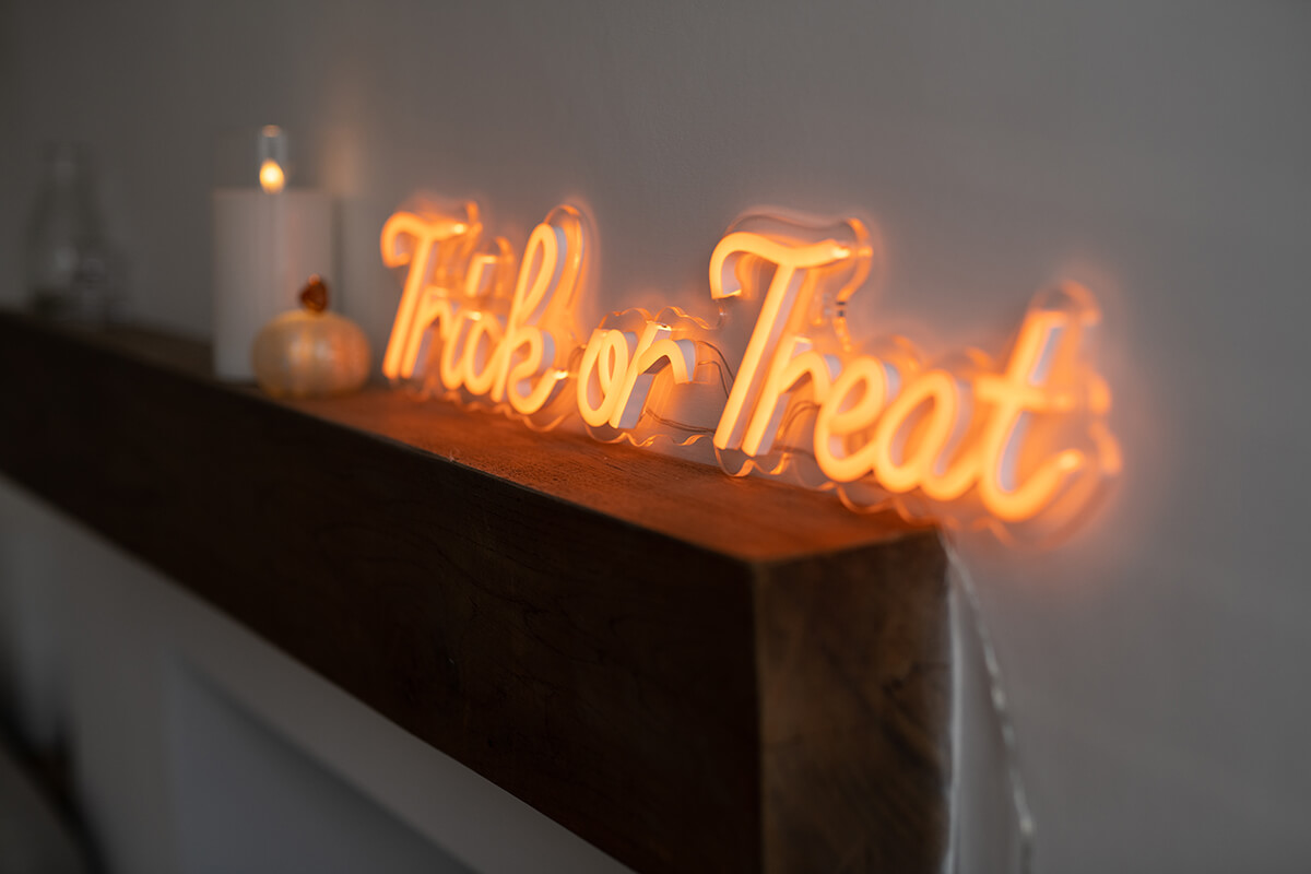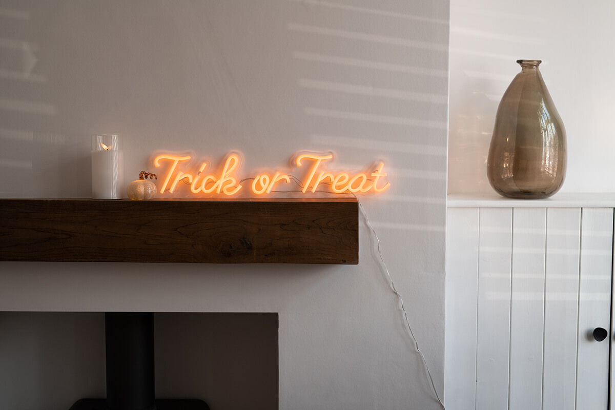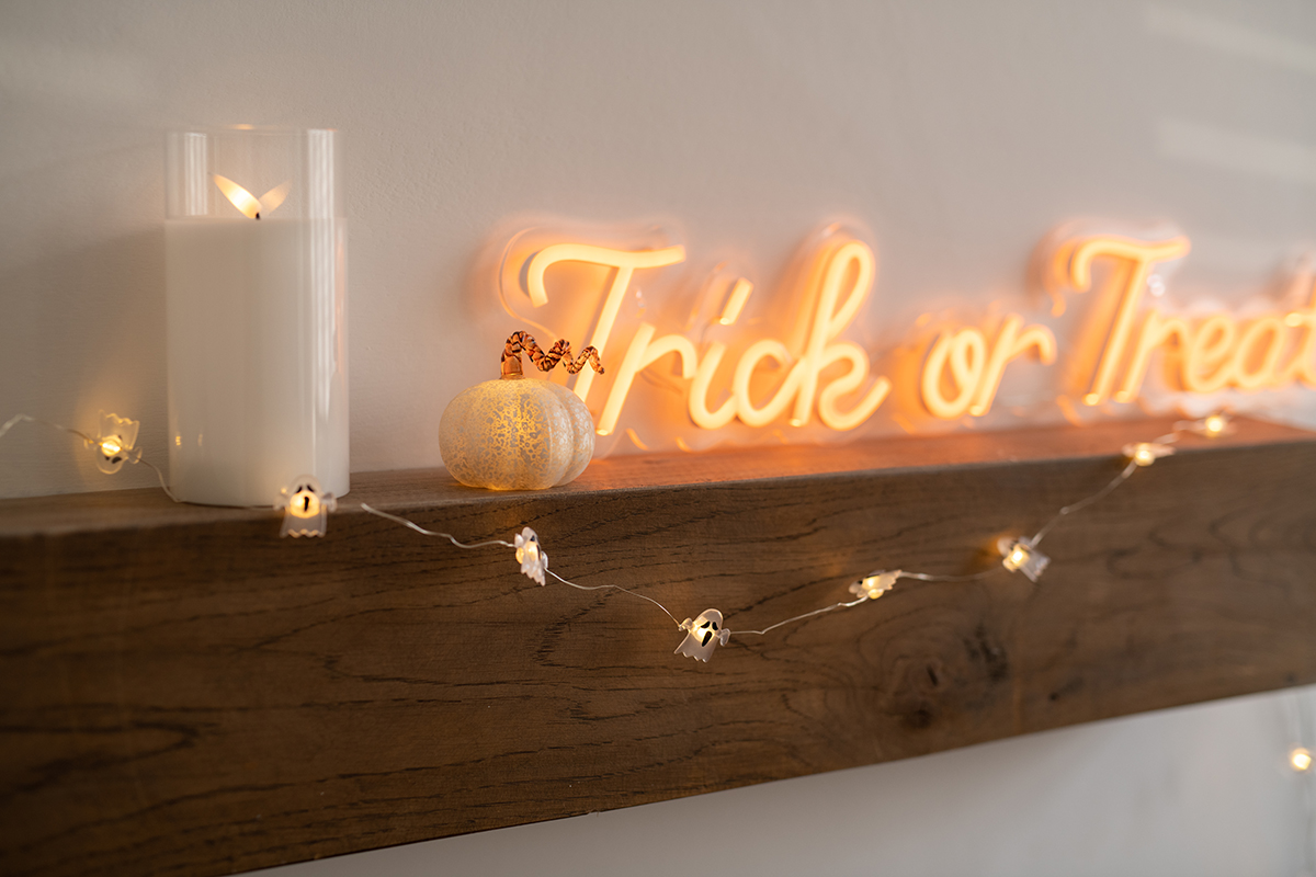 Lots of pretty pumpkins in coppers and gold, a massive glass pumpkin with a candle and a fabulous trick or treat neon light. Who doesn’t love a neon light?! The great thing about all of these products is you can use them year after year.