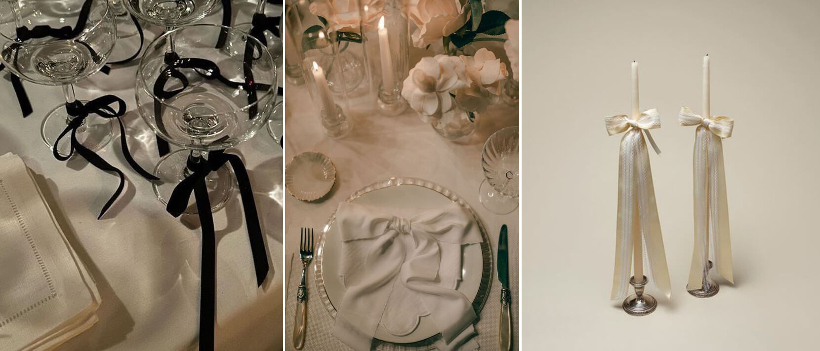 I think bows will be huge this year at 2024 weddings. On everything from table decor to hair, I see bows being BIG. I especially love the black bows around the glasses. So simple but so effective.